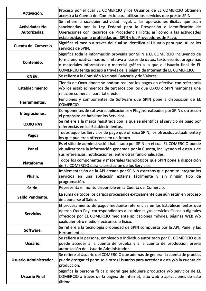 Mediante la aceptación de los presente Términos EL COMERCIO acepta que SPIN realice la prestación del servicio de procesamiento de pagos mediante referencias en los Establecimientos que operen el servicio OXXO PAY; correspondientes a los bienes y/o servicios físicos o digitales ofrecidos por EL COMERCIO mediante aplicaciones móviles, páginas WEB y/o cualquier otro medio electrónico o físico (en adelante los “Servicios”).